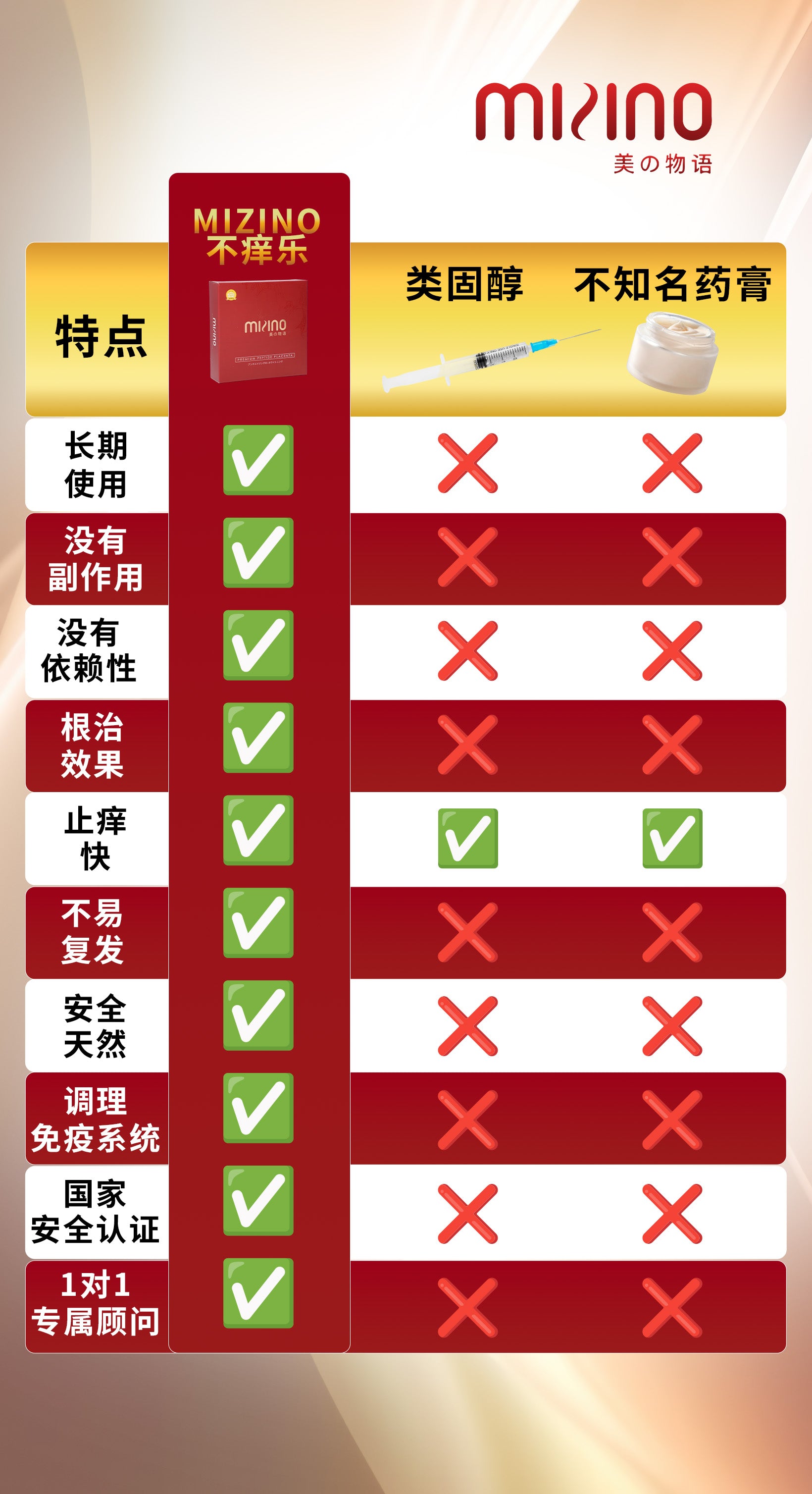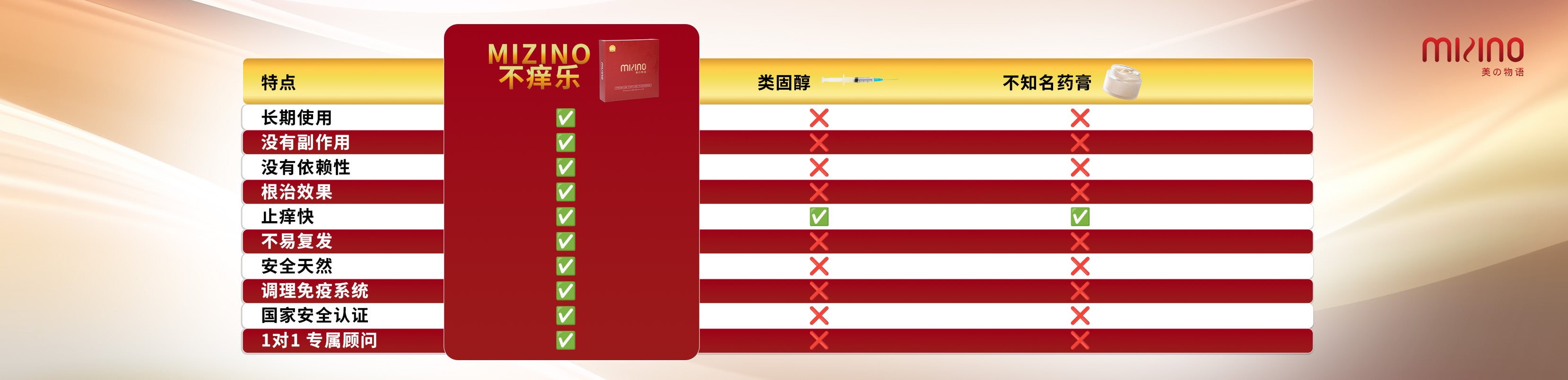市面药膏多数是外擦暂时止痒,而 Mizino从身体内部调理免疫系统、脾胃毒素,让皮肤从根本调理好